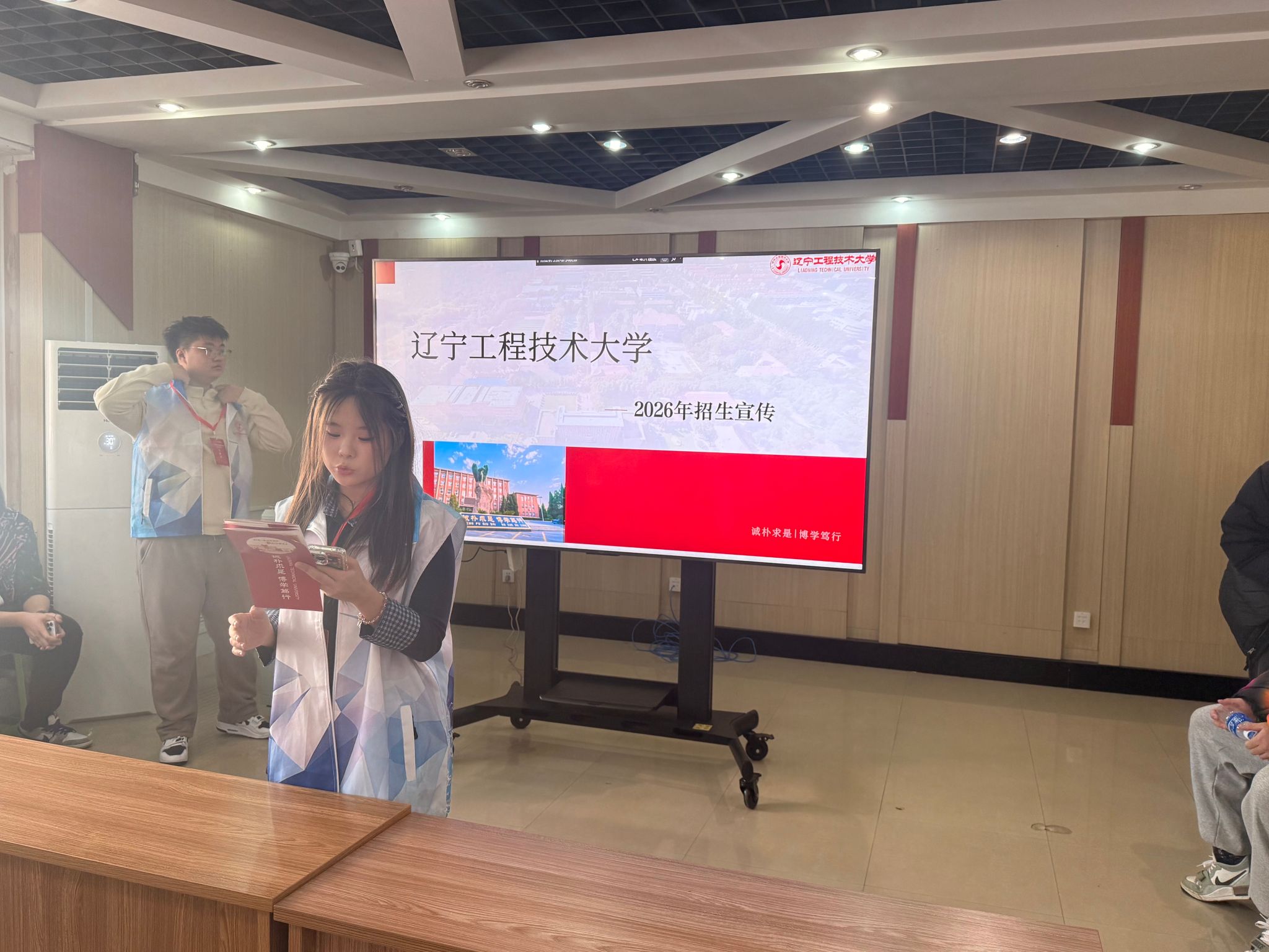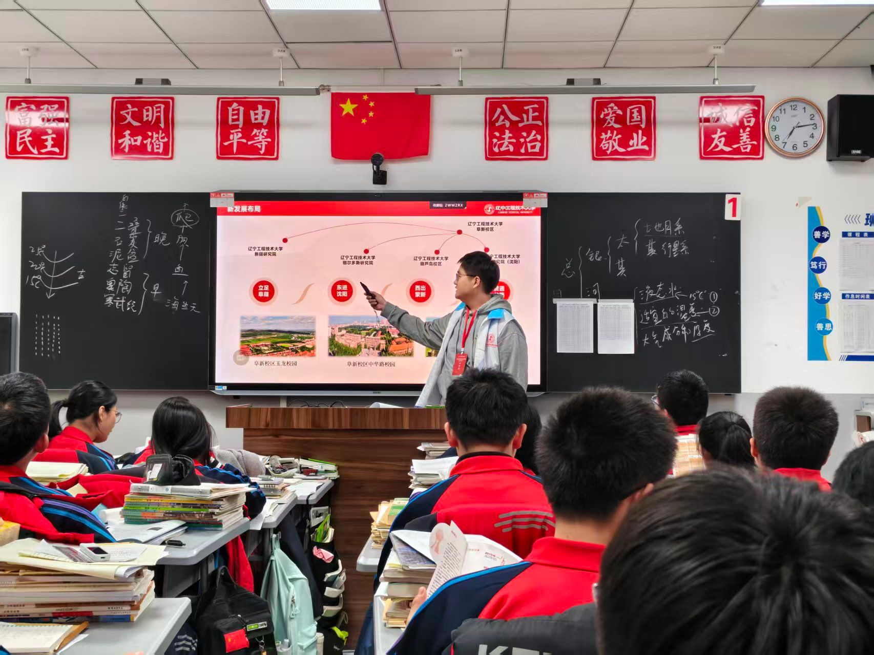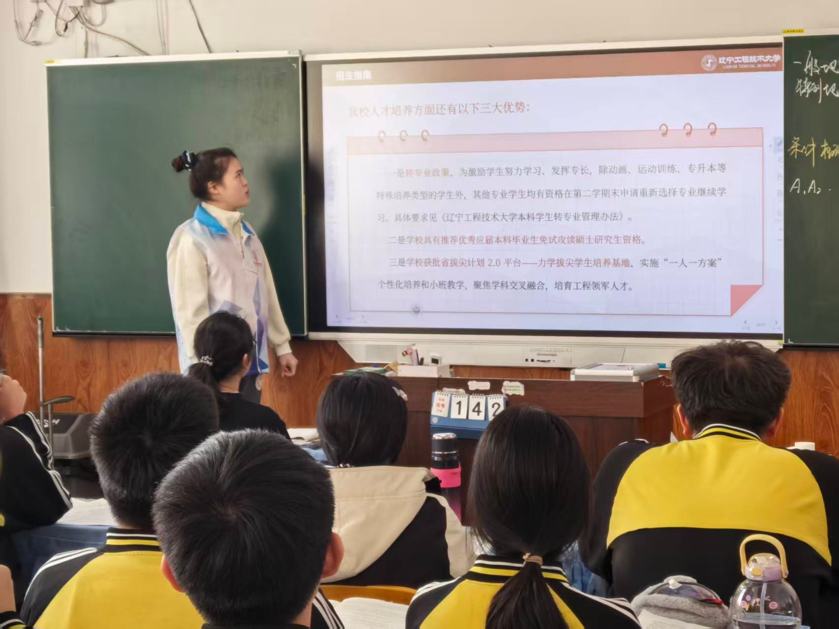 带着感恩与使命奔赴的,还有安全25-2班的程浩然同学。他重返母校乌海市第一中学,熟悉的教室、恩师的笑容与学弟学妹们期待的眼神,让他深感肩上的责任。作为辽工程学子,他不仅要回馈高中母校的培育之恩,更要传递这所工科强校的荣耀与发展机遇。宣讲中,程浩然以辽工程的深厚底蕴为切入点,结合视频与图片资料,重点展示了学校在矿山工程、安全工程、测绘工程等领域的国家级重点学科与科研平台,强调学校作为原煤炭工业部隶属重点高校的行业地位与工程教育优势。他还通过校园生活影像,生动呈现了两校区优美的环境、现代化的教学设施以及丰富多彩的科技文化活动,让学弟学妹们仿佛身临其境。尤为动人的是,他将自身成长与辽工程的培养紧密相连,分享了学校提供的竞赛支持、校企合作机会与广阔就业前景,鼓励心怀科技报国之志的学弟学妹们,将辽工程作为全力奔赴的卓越选择,让“诚朴求是、博学笃行”的校训精神在分享中悄然传递。
