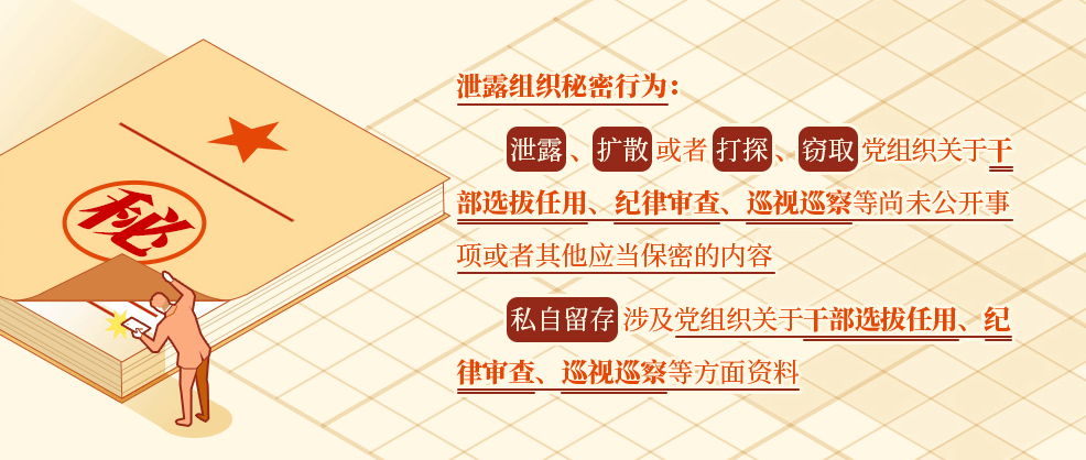 “严守党的纪律,保守党的秘密”,是每名党员入党宣誓时的郑重承诺。无论选人用人工作、纪律审查工作,还是巡视巡察等工作,都有严格的保密纪律。《党政领导干部选拔任用工作条例》规定,选拔任用党政领导干部,不准私自泄露研判、动议、民主推荐、民主测评、考察、酝酿、讨论决定干部等有关情况。《中国共产党纪律检查机关监督执纪工作规则》规定,监督执纪人员不准私自留存问题线索和涉案资料,严禁泄露审查调查工作情况,对纪检干部私存线索、跑风漏气、违反安全保密规定等违纪行为要严肃处理。《中国共产党巡视工作条例》规定,巡视工作人员私自留存巡视工作资料,泄露与巡视工作有关的未公开信息的,要给予处理处分。党员干部必须充分认识保守党的秘密的极端重要性和自身肩负的保密责任,对组织尚未公开的事项守口如瓶,自觉筑牢保密防线。