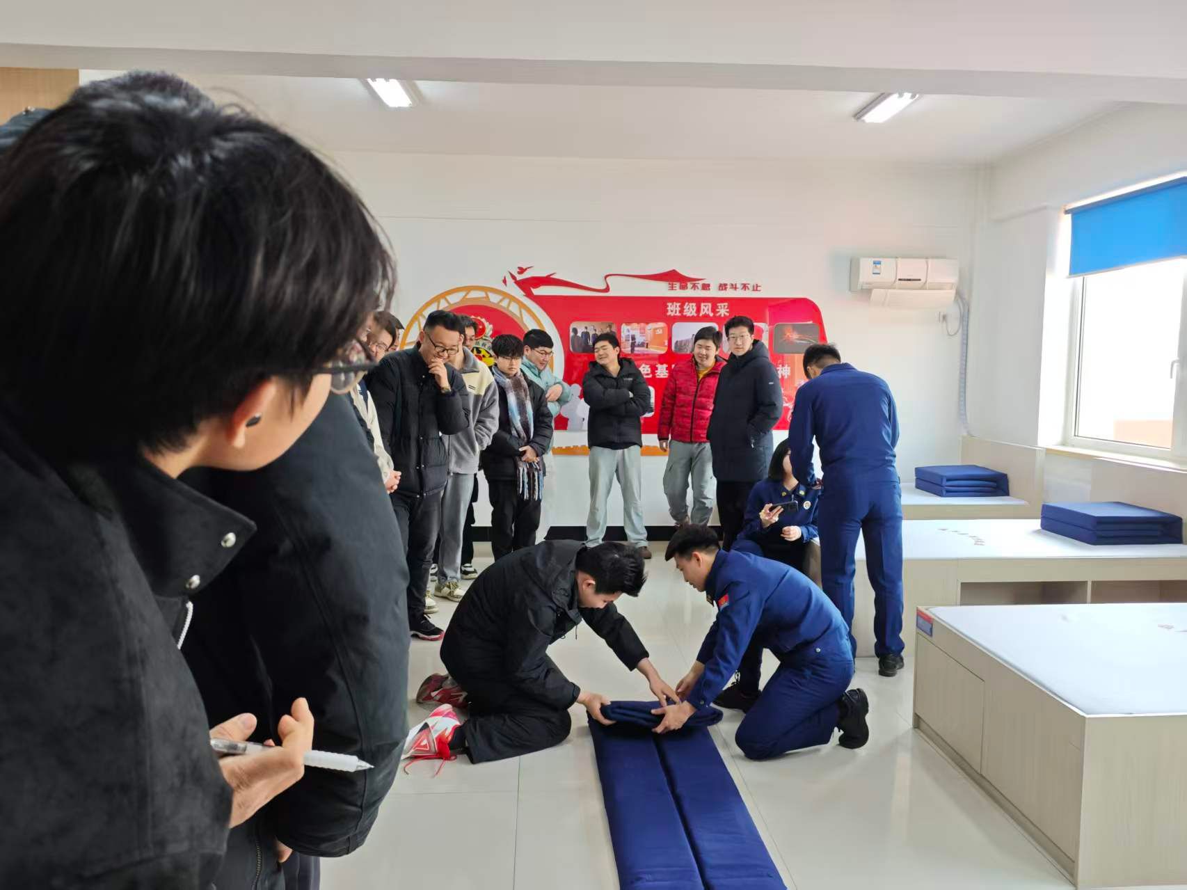 活动伊始,在指战员的带领下,师生们首先参观了营区生活区域,包括宿舍、训练区以及娱乐活动区。整洁有序的内务环境、规范化的管理制度以及严谨高效的队伍氛围给师生们留下了深刻印象。通过讲解,学生们不仅了解了消防救援人员的日常训练与生活情况,也切身感受到了应急救援队伍严明的纪律性和高度的团队协作精神。