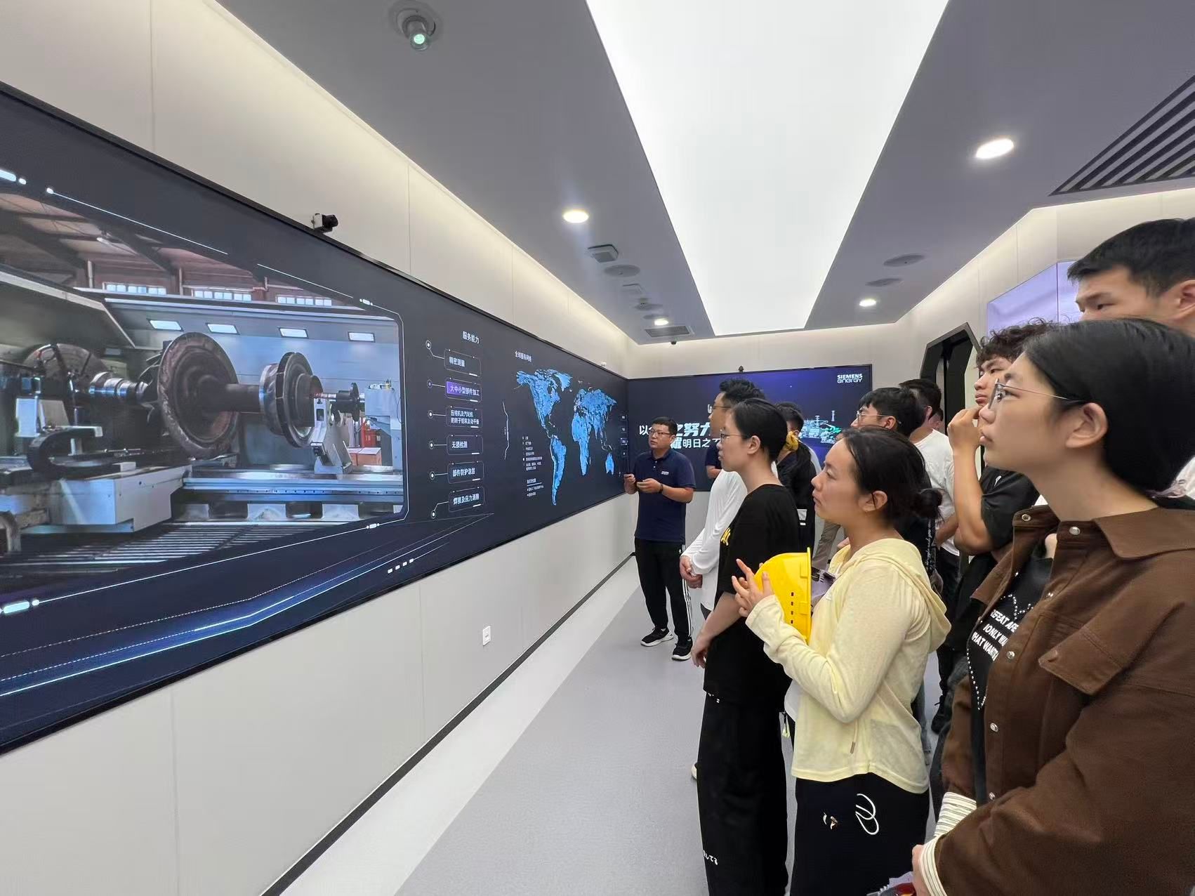 最后,师生们参观了西门子现代化展厅,通过沉浸式交互系统学习了工厂安全准则、国际标准化的安全管理流程以及数字化技术在风险防控中的创新应用。